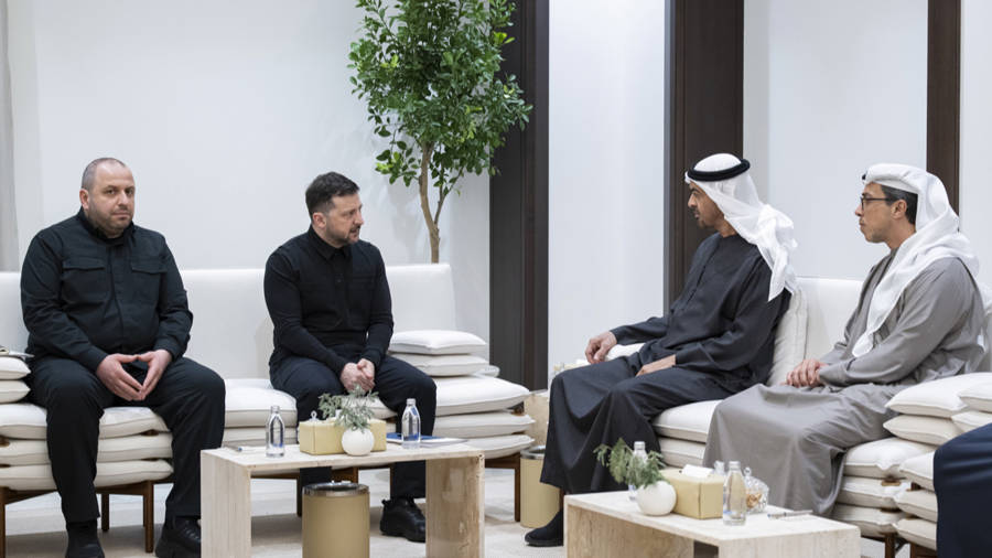 3月28日,阿联酋总统穆罕默德(右二)在阿布扎比会见到访的乌克兰总统泽连斯基(左二)。 新华社发