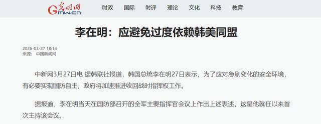新华网:李在明称将尽快推进收回战时指挥权(2026-03-27) 央视新闻:韩国总统李在明召开全军会议 强调加速收回战时指挥权(2026-03-27) 李在明:应避免过度依赖韩美同盟