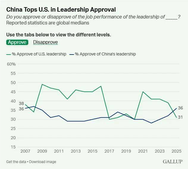 据新华网报道,美国民调机构盖洛普公司4日发布的全球民意调查结果显示,2025年中国在全球认可度方面超过美国,对中国领导力的支持率中位数为36%,领先美国5个百分点。