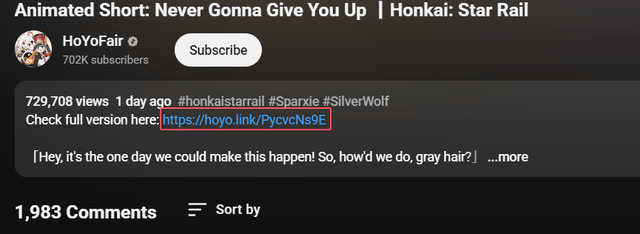 按理说,大家早已对这个梗习以为常,但崩铁制作组的做法却格外用心。为了好好玩梗、不触碰版权红线,他们特意向歌曲发行商和版权方申请并拿到了正版授权,更贴心地在 YouTube 简介中附上了原版歌曲链接。既陪玩家一起整活,又坚守底线尊重原创,这份诚意直接拉满。