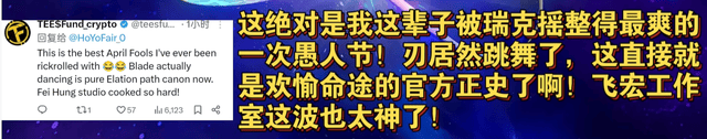 不少外网玩家纷纷表示,这是自己被Rickroll整得最开心的一次。而国内玩家同样热情高涨,不少人甚至在弹幕中直言,这次是心甘情愿被Rickroll,毫无抵触感。